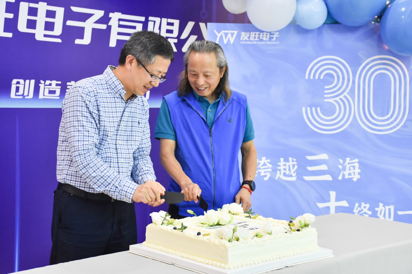 故事分享结束,罗总与李总共同分切生日蛋糕,大家一同祝愿友旺30岁生日快乐,将活动气氛推向高潮。