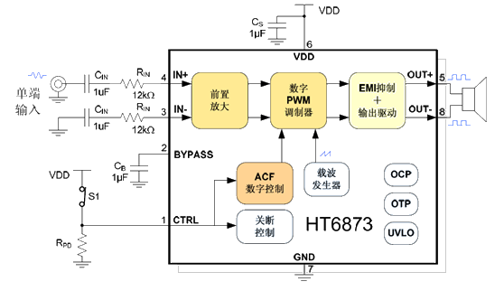 UTC5813是一款高保真超低EMI的,具有防削顶失真功能的单声道免滤波D类音频功率放大器。在5V电源,10% THD+N,4Ω负载条件下,输出3.5W高功率,在各类音频终端应用中维持高效率并提供AB类放大器高保真、低噪声的性能。