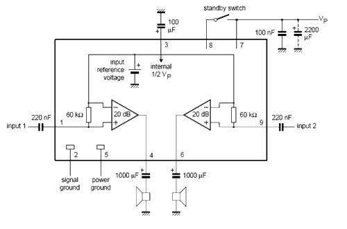 *高输出功率 *固定增益 *良好的纹波抑制 *静音/待机开关 *交流和直流对地和VP短路保护 *热保护 *反极性安全 *输出能力高(VP = 0 V) *没有开启/关闭噪声 *静电放电保护。
